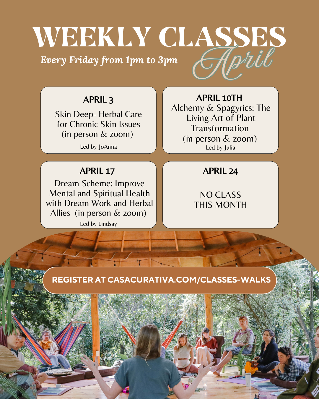 Each week Friday from 1:00 - 3:00 CST, we gather for class with Casa Curativa’s teaching team. These classes rotate through the seasons and sessions are tailored to explore a wide variety of herbal topics and community requests.